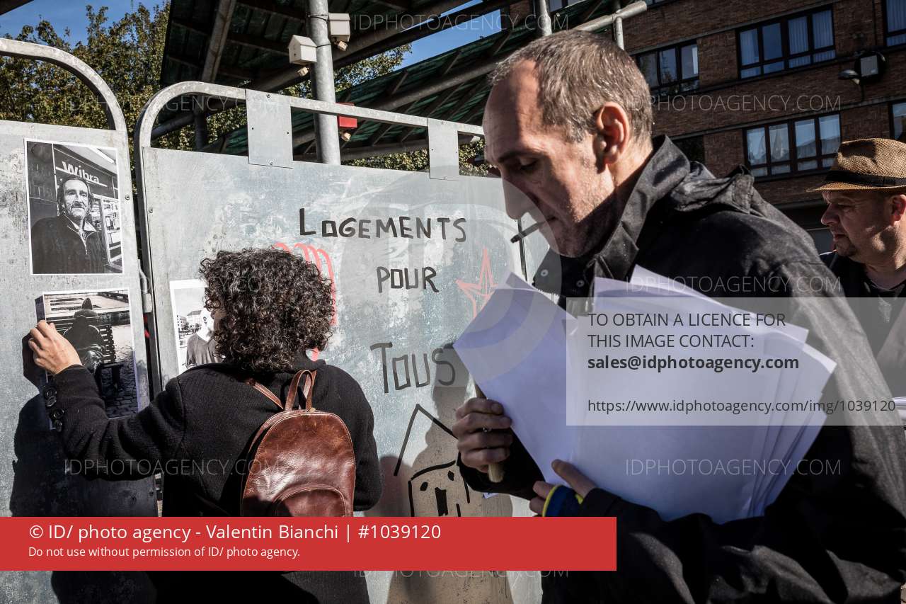 Liège, Belgique. Mercredi 26 Septembre 2018. Un collectif de citoyens a décidé de réaliser une action "choc" afin de contester le manque d'actions des politiques par rapport aux SDF, juste avant les élections. Ils ont ainsi collés des centaines de photos de SDF de la cité ardente par dessus les affiches électorales sur la Place des déportés.