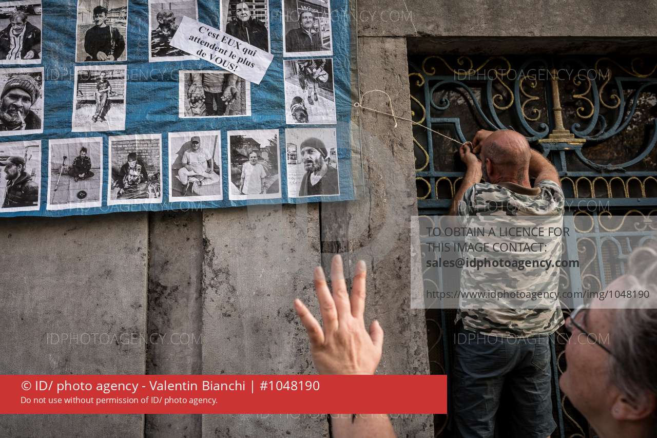 • Liège, Belgique. 12 Octobre 2018. Action citoyenne visant à  afficher deux banderolles représentant des photos de SDF liégeois sur l'hôtel de ville de Liège situé Place du Marché. L'action a également été l'occasion à  un petit groupe de SDF de conscientiser les passants sur la problèmatique de la pauvreté. Cette action symbolique se tient 48h avec les élections communales du dimanche 14 Octobre 2018.