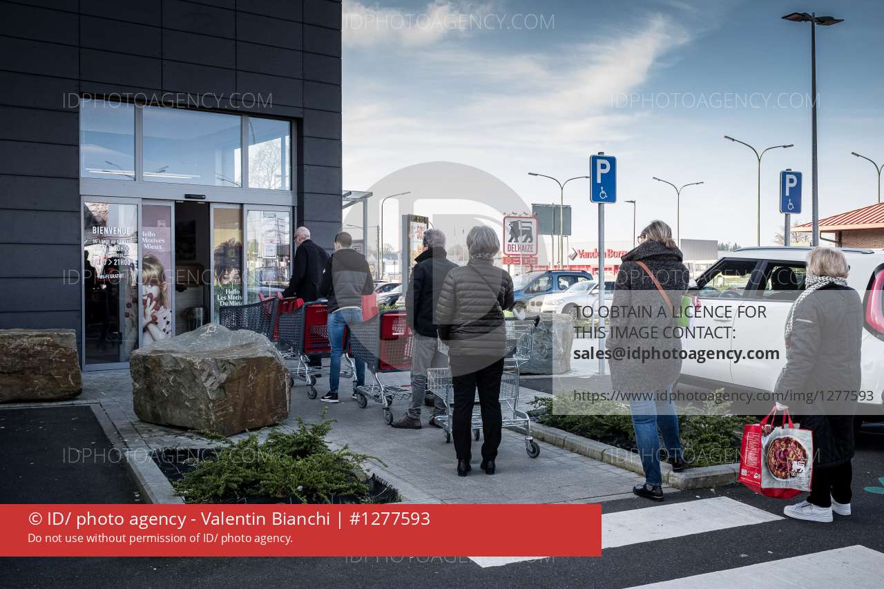 Liege, Belgium. March 17, 2020. Despite media announcements, Belgian citizens are rushing to the shops to buy food. Lines are starting to form outside the shops.â¨â¨Liège, Belgique. 17 Mars 2020. Malgré les annonces médiatiques, les citoyens belges se ruent dans les magasins pour acheter des denrées alimentaires. Des files commencent à se former à lâextérieur des magasins.