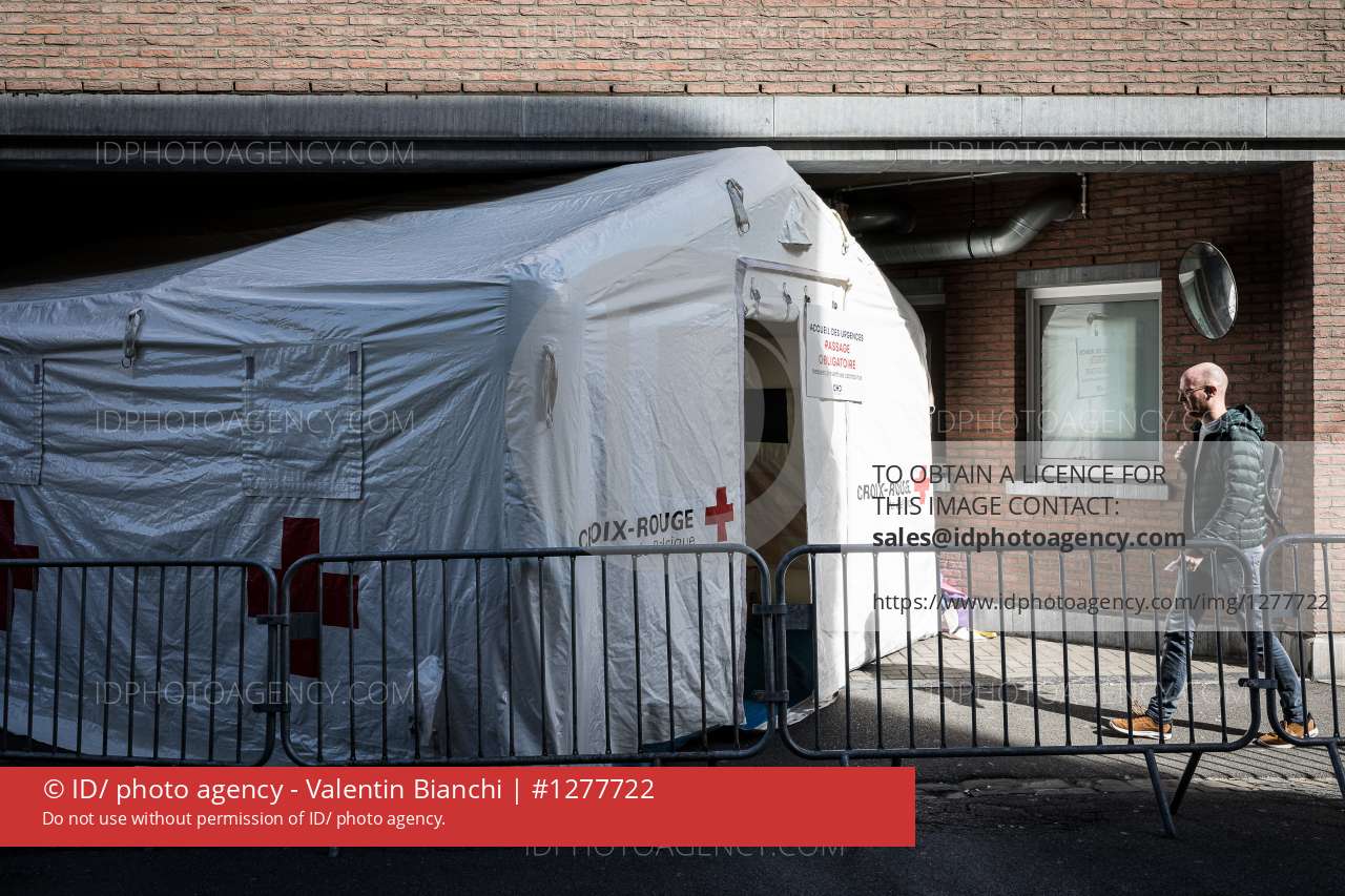 Liège, Belgium. 17 March 2020. The hospital of the CHR St-Joseph in Liège has set up a Red Cross tent in order to adapt its reception procedure to emergencies and thus cope with the outbreak of the Covid19 Coronavirus.â¨â¨â¨Liège, Belgique. 17 Mars 2020. Lâhôpital du CHR St-Joseph à Liège a installé une tente de la Croix-Rouge tafin dâadapter sa procédure dâaccueil aux urgences et ainsi faire face à lâépidémie de Coronavirus Covid19.