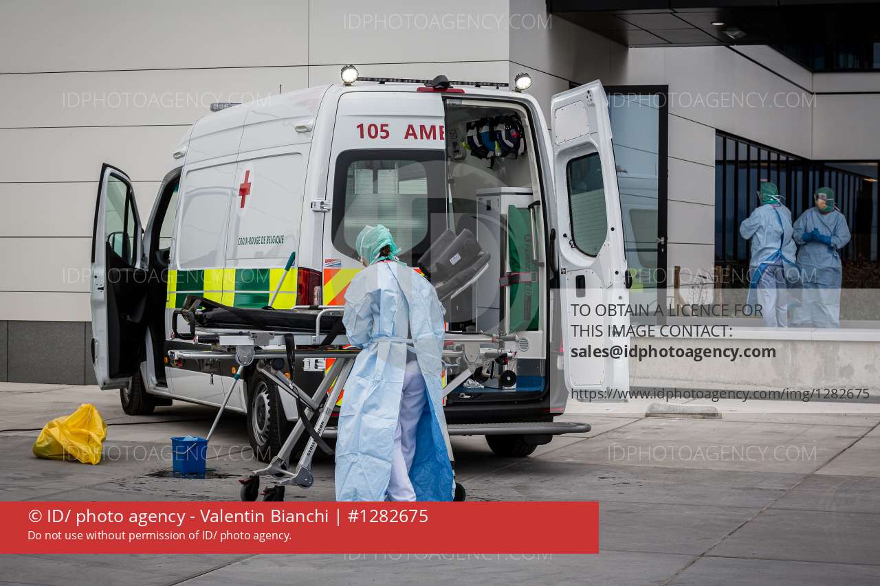Liege, Belgium. March 20th, 2020. Every ambulance, after transporting a patient with Covid19 must be carefully disinfected. A nurse takes care of this delicate task while two of her colleagues are preparing to receive a newborn baby affected by the Coronavirus.â¨â¨Liège, Belgique. 20 Mars 2020. Chaque ambulance, après avoir transporté un patient atteint du Covid19 doit àªtre soigneusement désinfecté. Une infirmière sâoccupe de cette tà¢che délicate alors que deux de ses collègues sâappràªtent à recevoir un nouveau-né atteint par le Coronavirus.