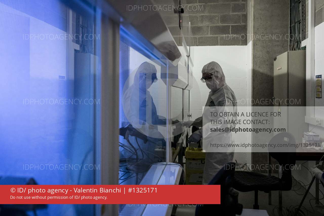 Liege, Belgium. June 9th, 2020. Finally, the expected delivery will not arrive. Professor Sadzot informed her team that they could stop for the day. She cleared out the laboratory and placed the UV lamps that will destroy any germs or viruses present under the laboratory hoods. â¨Liege, Belgique. 9 Juin 2020. Finalement, la livraison attendue n arrivera pas. Le professeur Sadzot a prevenu son equipe qu il pouvait arreter pour aujourd hui. Elle range le laboratoire et place les lampes a UV qui aneantirons tout germe ou virus present sous les hottes.
