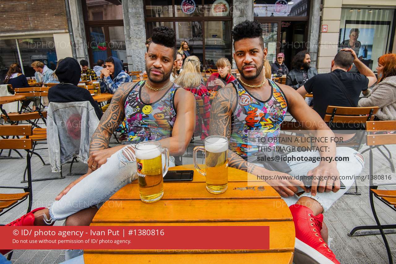 2020/06/10 brussel belgium : de horeca mag terug open na de lockdown, 2 mannen, een tweeling geniet van een biertje op een terras aan het beursgebouw in brussel