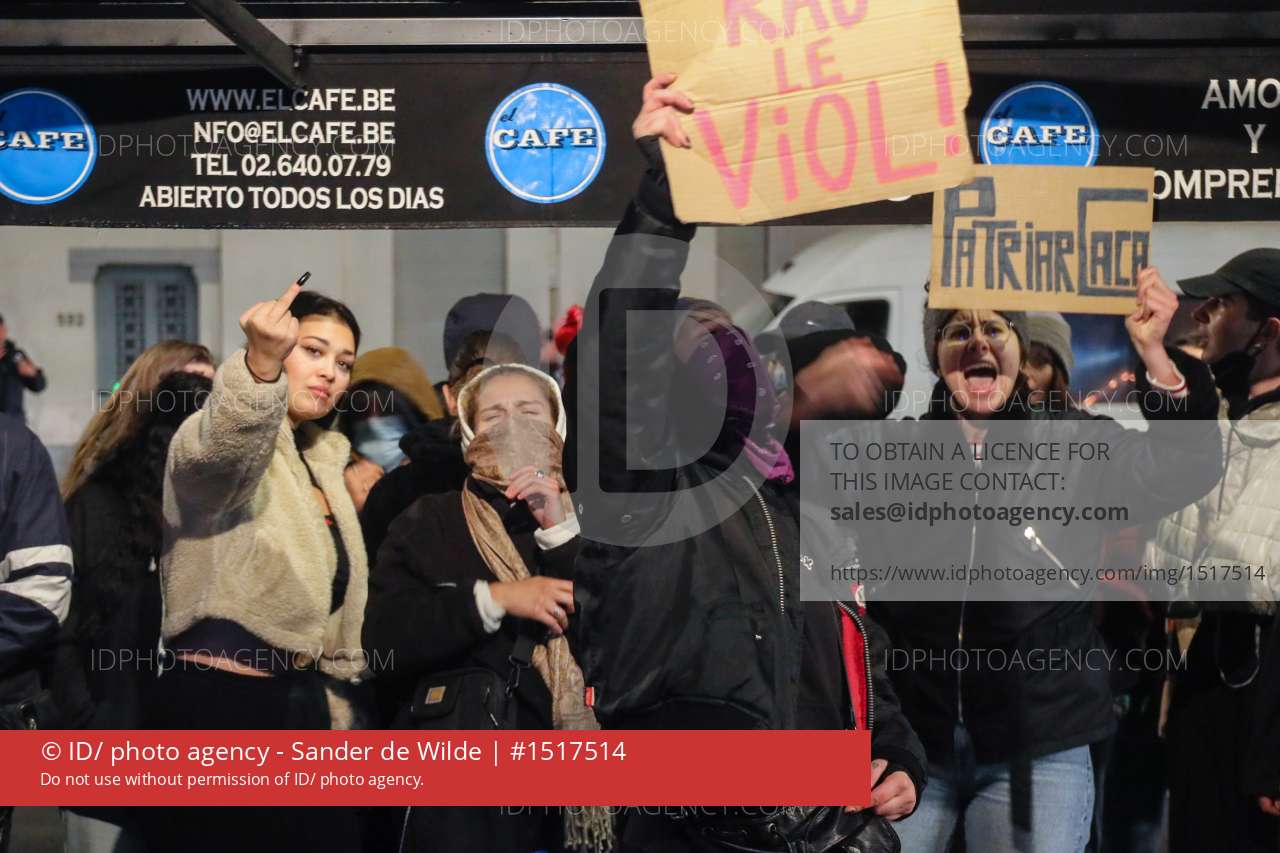 Brussel Belgium 2021 21 Oktober. In de Brusselse gemeente Elsenebetoogden een 500-tal manifestanten nadat bekend raakte dat een barman van de cafés Waff en El Café verschillende vrouwen zou hebben gedrogeerd en verkracht. BIJ CAFE LE CAFE WERDEN DE PROTESTANTEN DOOR DE POLITIE BUITEN GEHOUDEN