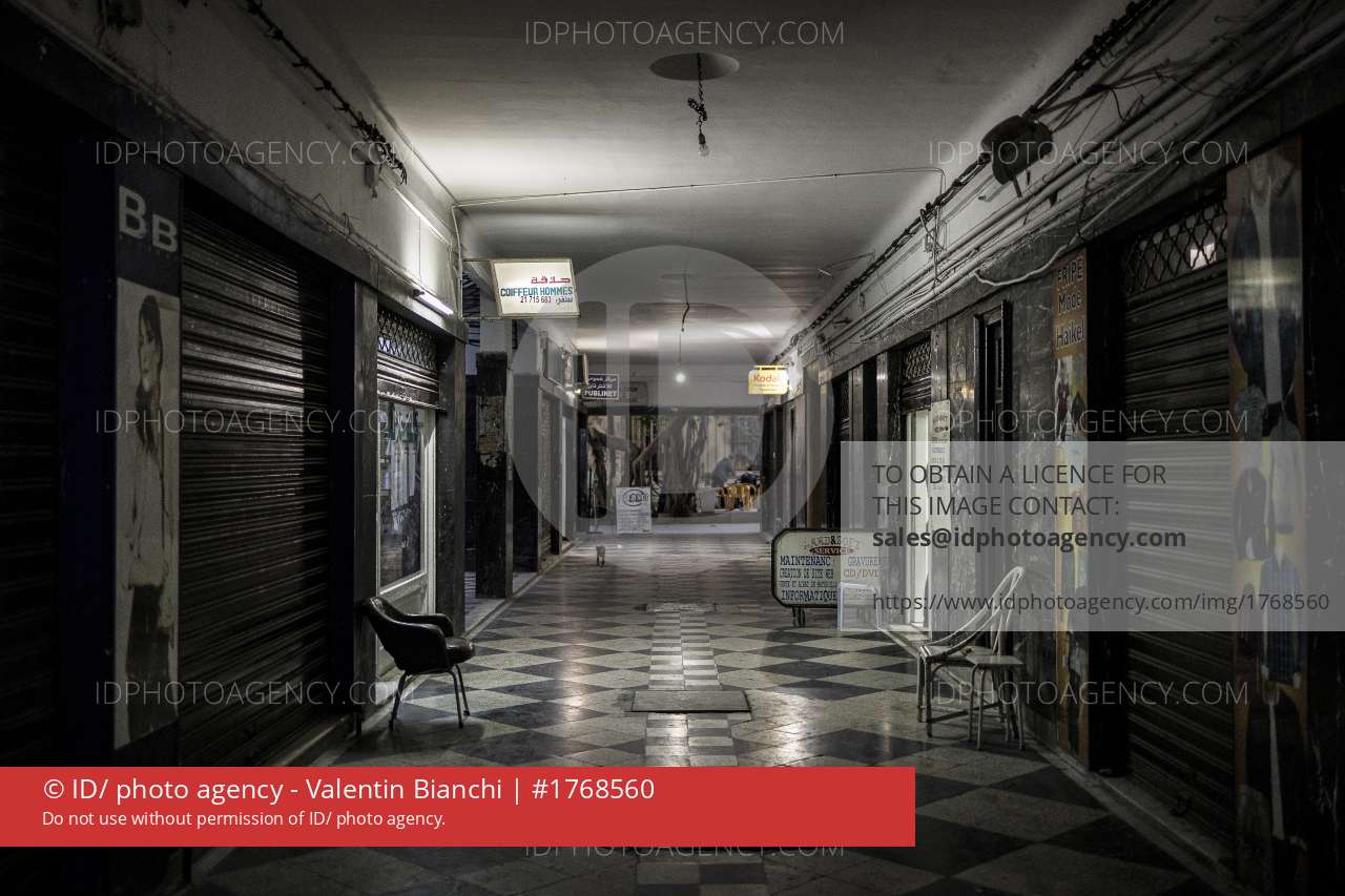 Tunis, Tunisie. 2023-03-02. Un chat marche dans une petite galerie commercante. La crise economique qui frappe le pays est a l origine de nombreuses fermetures de petits commerces.