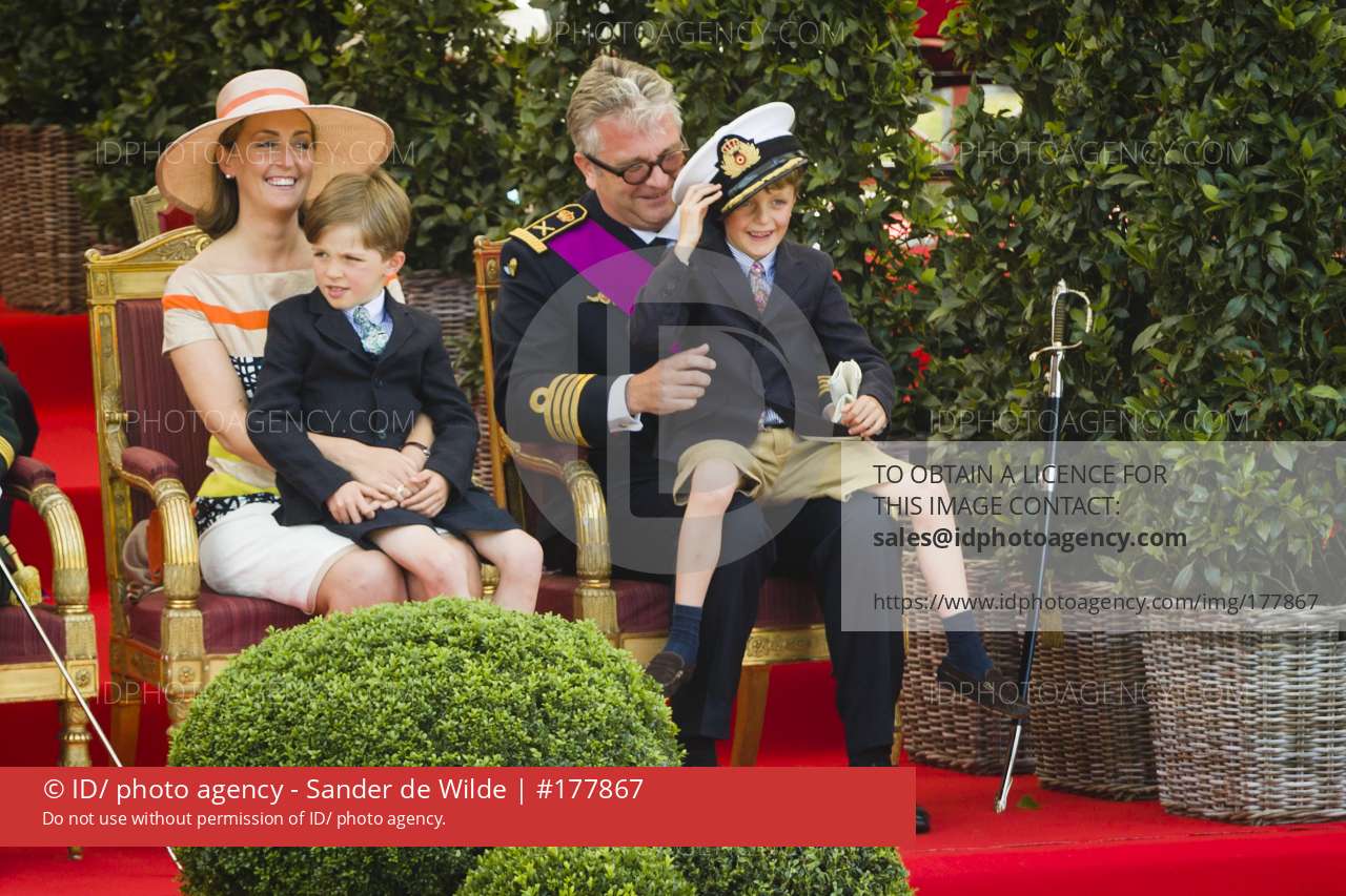 • Belgiums National Day in Brussels July 21, 2012. Belgium celebrates its national day and its 182nd anniversary of independence on this Saturday with a military parade in front of the Royal Palace. From left to right, in the back princess Laetitia Maria, daughter of Prince Lorenz and Princess Astrid left and princess Clair and Prince Laurent with their children Nicolas and Aymeric, Nicolas is trying fathers hat.
