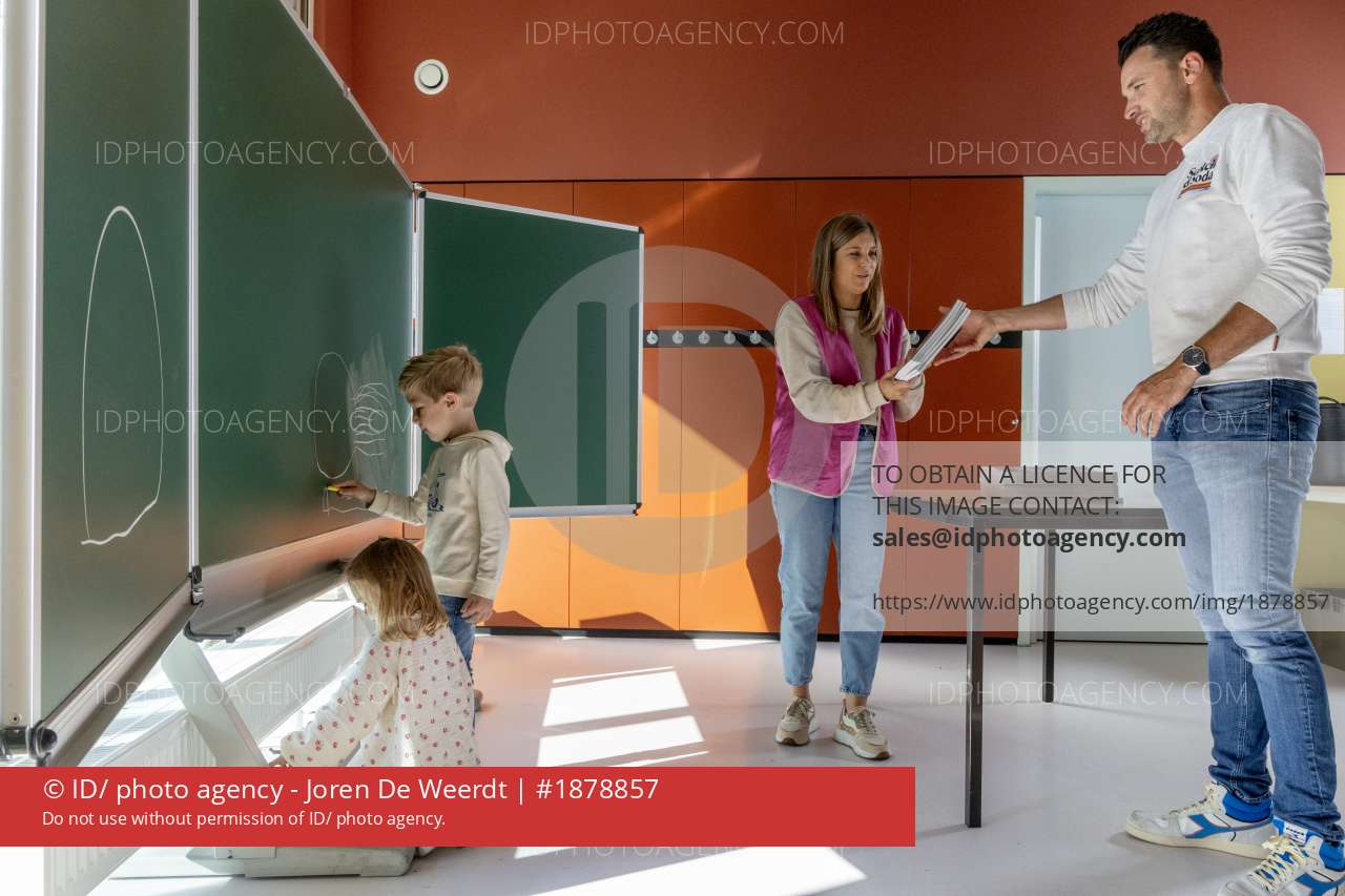 Jolien en Tim Spinnoy en hun twee kindjes gaan op 1 september allemaal samen naar dezelfde school Leerkrachten Jolien Spinnoy en Tim Bouwens geven beide les op de basisschool in Duffel en starten nu 1 september naast elkaar in de klas-kindjes Lenne en Mil zitten in dezelfde school-foto joren de weerdt