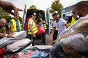 Bilal El Maadioui curtomer service van moer. En man voor ambulance die hem zelf gaat rijden naar M: Billy Jaffal - vrijwilliger de ambulance brengen. Ilham Zahi vrouw met witte hoofddoek en blauwe blousse aan de tassen. Was hier als eerste met nog maar 4 vrijwilligers.