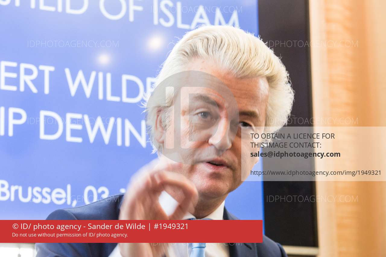 Brussels Belgium 2017 3 november Right wing anti islam politicians Geert Wilders (PVV) (NL) en Filip Dewinter (Vlaams Belang)(BE) speak to the press at the Belgian Federal Parliament during a pressconference. They were supposed to visit the Molenbeek community for an ISlam Safari but this was forbidden by the Mayor of Molenbeek.
