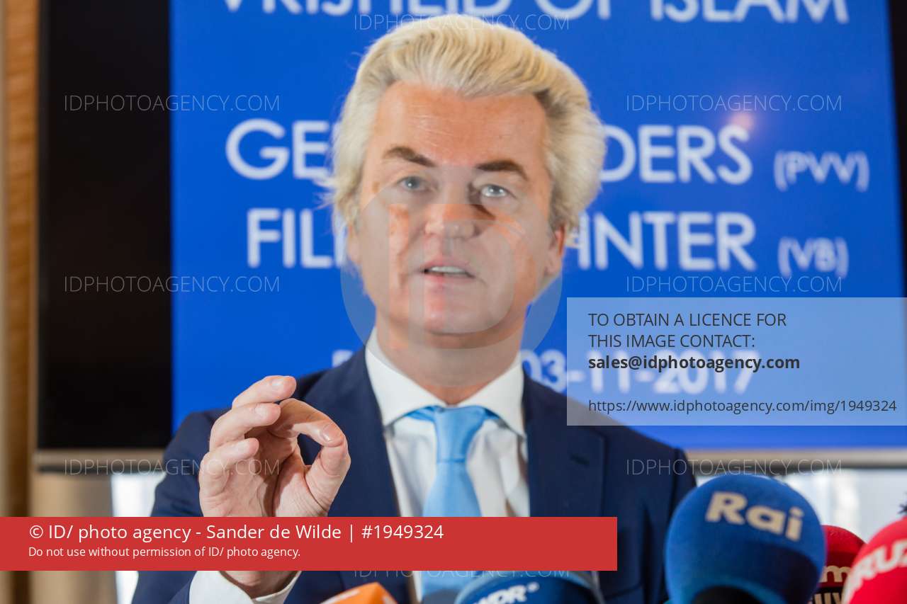 Brussels Belgium 2017 3 november Right wing anti islam politicians Geert Wilders (PVV) (NL) en Filip Dewinter (Vlaams Belang)(BE) speak to the press at the Belgian Federal Parliament during a pressconference. They were supposed to visit the Molenbeek community for an ISlam Safari but this was forbidden by the Mayor of Molenbeek.