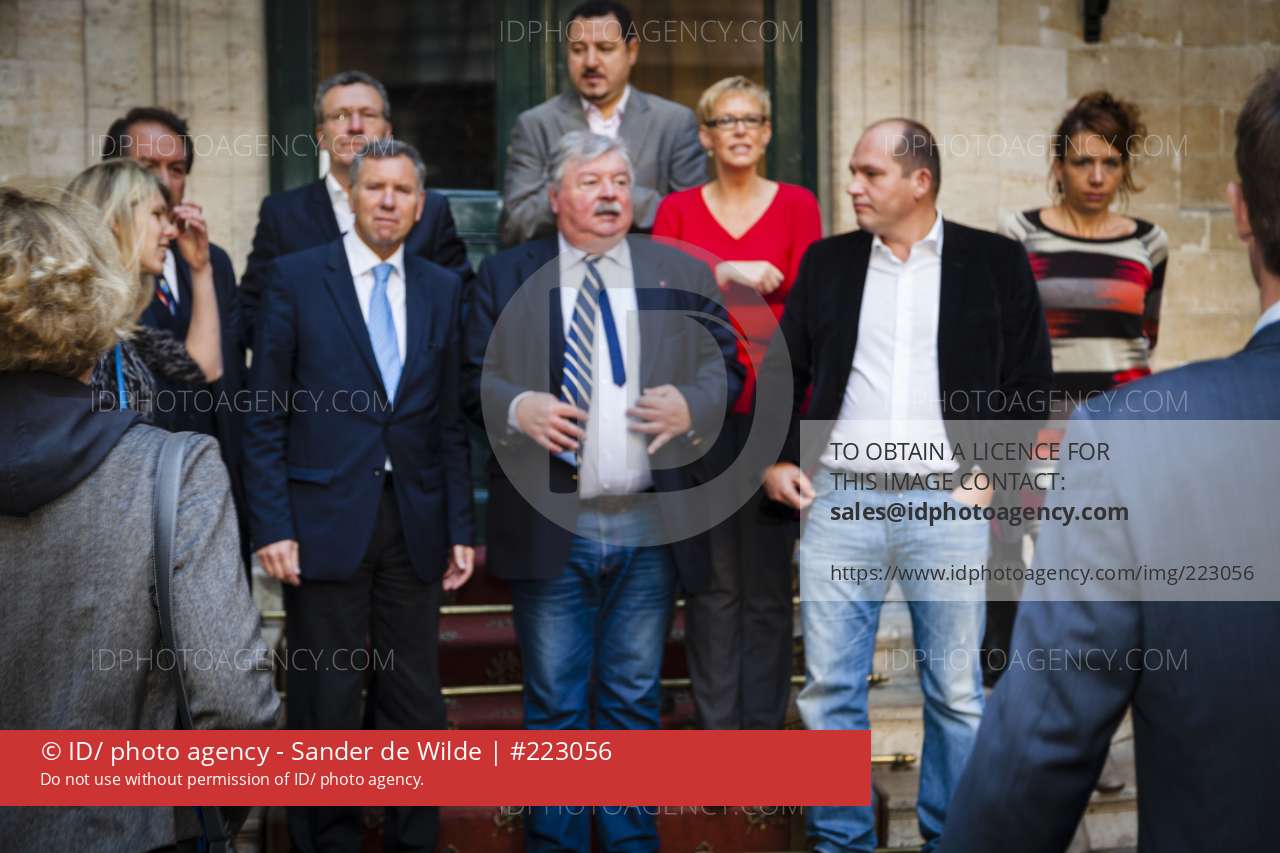 • Brussel 15 oktober 2012. Burgemeester Freddy Thielemans stelt het nieuwe schepencollege van Brussel-STAD voor met Alain Courtois wordt eerste schepen. In het schepencollege herkennen we verder Marion Lemesre, Alain Courtois, Philippe Close, Karine Lalieux, Ahmed El Ktibi, Els Ampe, Ans Persoons en Mohamed Ouriaghli.Groepsfoto buiten.