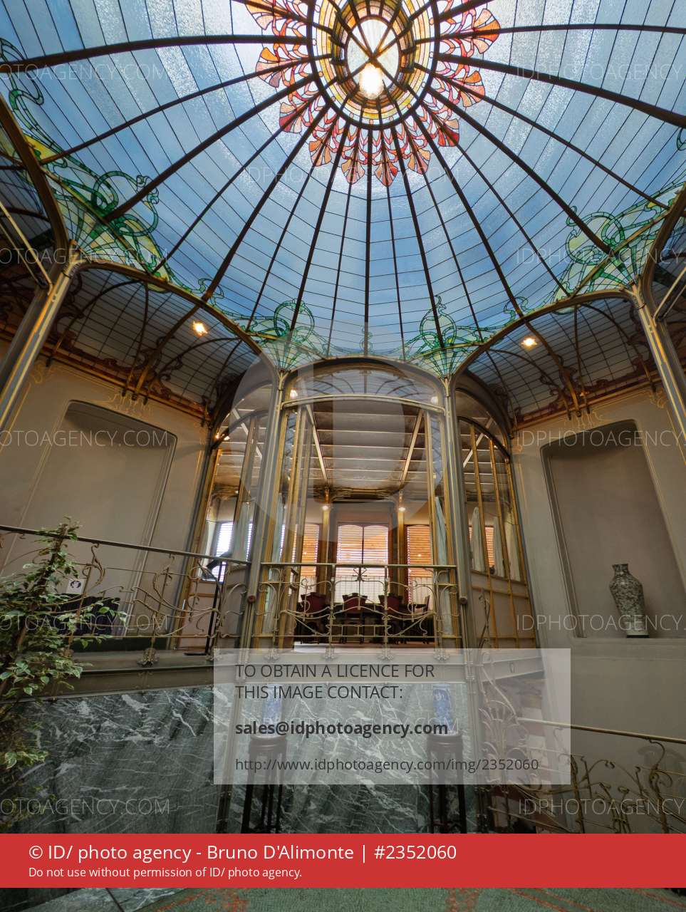 Hôtel van Eetvelde av. Palmerston 4, à Bruxelles, maison de maître de style Art nouveau édifiée par l’architecte Victor Horta.Coupole d'hiver illuminée de teintes vertes, roses et orangées qui crée un jeu magique de lumière tout au long de la journée, démontrant l'intégration pionnière de Horta des matériaux industriels avec l'art décoratif.