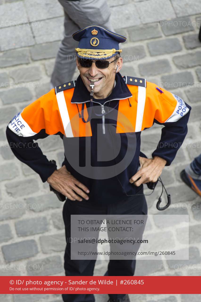 Belgium, Brussels, 19 May 2013. Belgian policeman with whistle smiles up at the photographer. About 80,000 participants at the Belgian Pride Parade to celebrate the LGBT Lesbian, gay, bisexual, transgender community and demand equal rights.