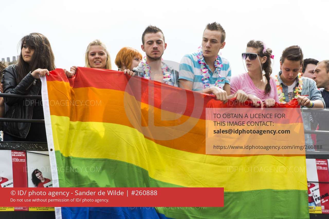 jongeren op parade met regenboogvlag. About 80,000 participants at the Belgian Pride parade. The Pride Parade is an event to celebrate the LGBT Lesbian, gay, bisexual, transgender community and demand equal rights.