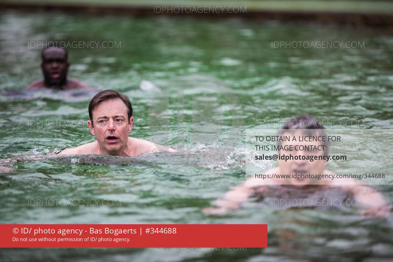 20140119. MORTSEL. De Bart De Wever en Ludo Van Campenhout nemen deel aan de Antwerpse bibberduik in de zwemvijver van het Boekenbergpark. FOTO BAS BOGAERTS