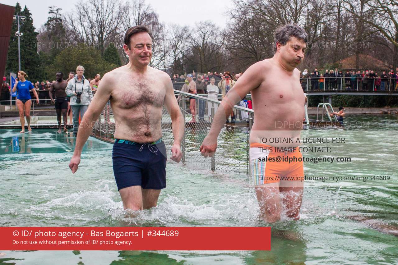 20140119. MORTSEL. De Bart De Wever en Ludo Van Campenhout nemen deel aan de Antwerpse bibberduik in de zwemvijver van het Boekenbergpark. FOTO BAS BOGAERTS