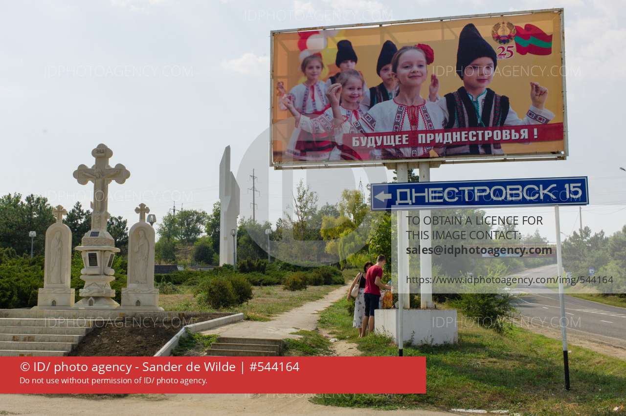 20150828 Moldova, Transnistria,Pridnestrovian Moldavian Republic (PMR) Pervomaisc,At the entrance of this village, close at the Ukrainan border a big bilboard celebrating the 35th anniversary of Transnistria is put besides a road sign pointing at Dnestrovs, Russian orthodox monument and a white war memorial.