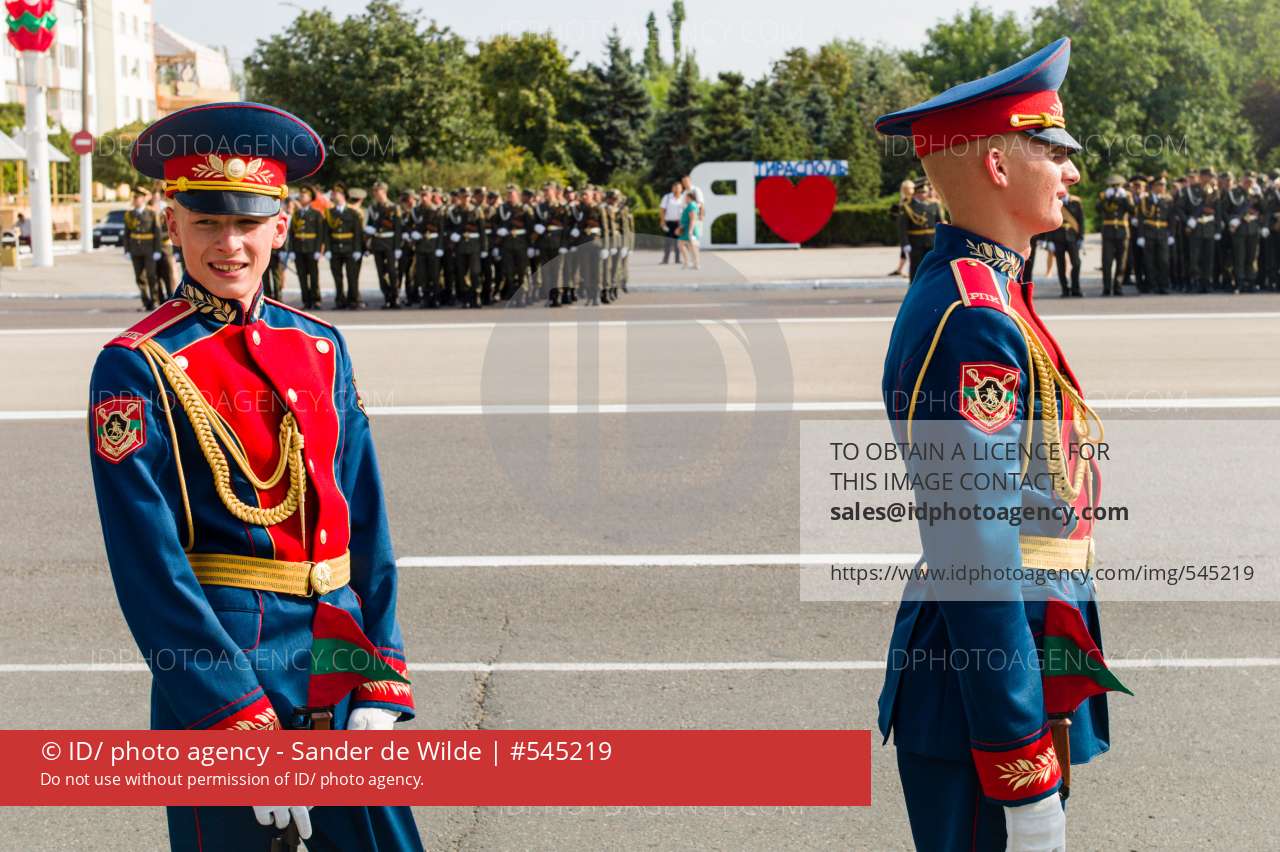 20150831 Moldova, Transnistria,Pridnestrovian Moldavian Republic (PMR) Tiraspol. Rehersal for the big parade, in the 25th Transnistrian independance day when they had a war separating from Moldova.young soldiers with transnistrian flags on their rifal waiting. I love Transnistria sign in the background.
