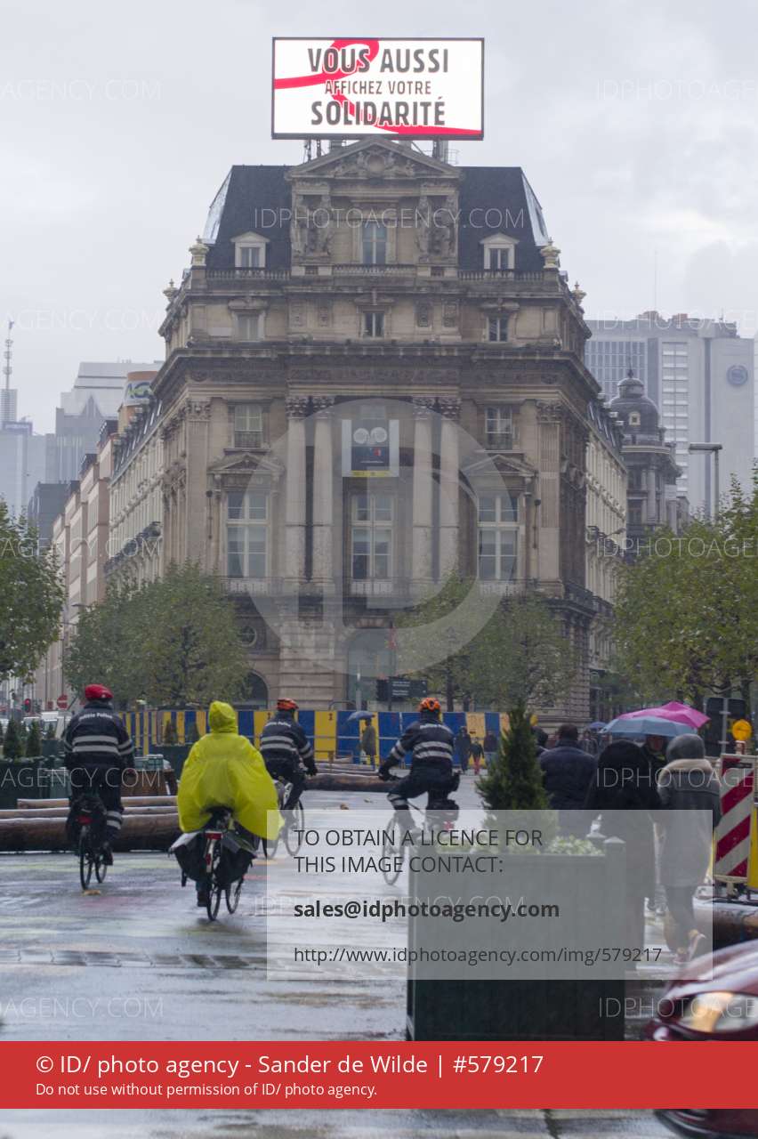 Brussels Belgium 21 November 2015. Terror alert level for Brussels was put at 4, the maximum on a scale of 1 to 4. There is "a very concrete and imminent threat".The city center, Brouckere square, where police on bicycles drive around for security reasons