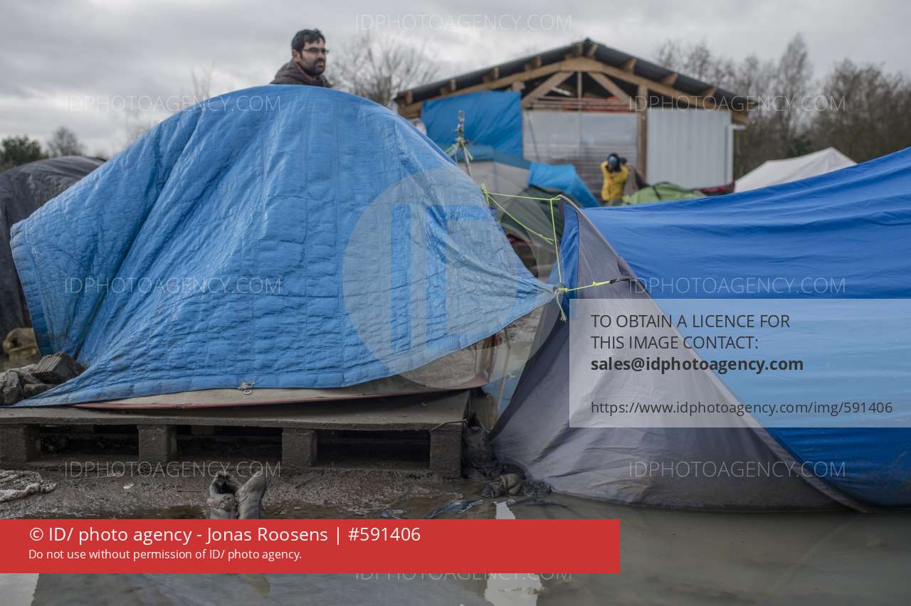 20160111, Dunkerque, France. Illustration image made in the refugee camp of La Grande Synthe in Dunquerke - Duinkerke, on a day when volunteers were allowed in to the camp to assist in making it a more humane environment for its inhabitants. The heavy rains over the past few days have transformed the site into a swamp.