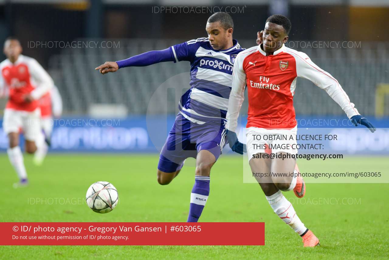 20160209-Anderlecht-Belgium-Stephy Mavididi(Arsenal) and Nathan De Medina( Anderlecht) in action during the game between RSCA and Arsenal FC for the UEFA Youth League (U19)