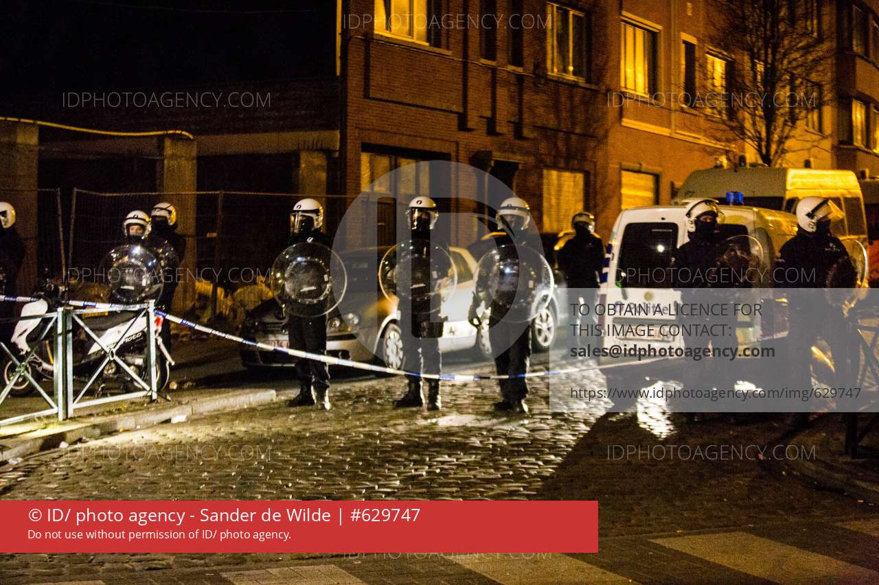 2016 18 March Brussels, Molenbeek, Belgium. The area around the four winds street, (vierwindenstraat) (rue des quatre vents) is shut down by the police after having arrested ISIL terrorist SALA Abdeslam . Police blocking the streets around the hide out