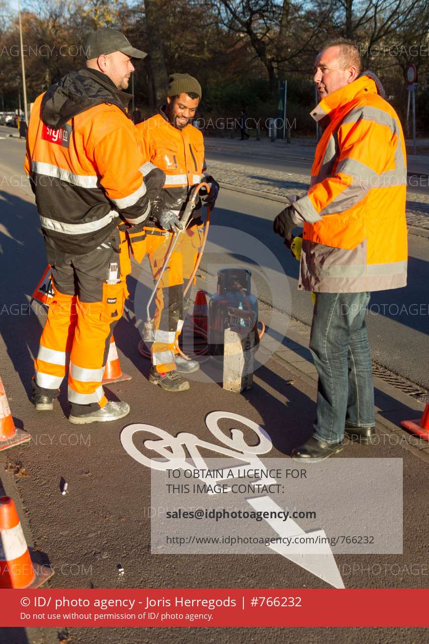 schepen voor mobiliteit Koen Kennis zet de eerste fietsrichtingspijl op het fietspad op de hoek van de Louiza-Marialei en de Rubenslei. de richtingspijlen die op een eenvoudige en duidelijke manier voor meer veiligheid en een betere doorstroming voor fietsers zorgen in de stad.Straat: Louiza-Marielei