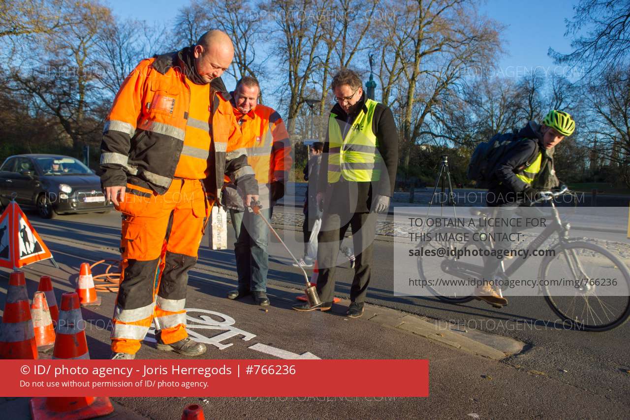 schepen voor mobiliteit Koen Kennis zet de eerste fietsrichtingspijl op het fietspad op de hoek van de Louiza-Marialei en de Rubenslei. de richtingspijlen die op een eenvoudige en duidelijke manier voor meer veiligheid en een betere doorstroming voor fietsers zorgen in de stad.Straat: Louiza-Marielei