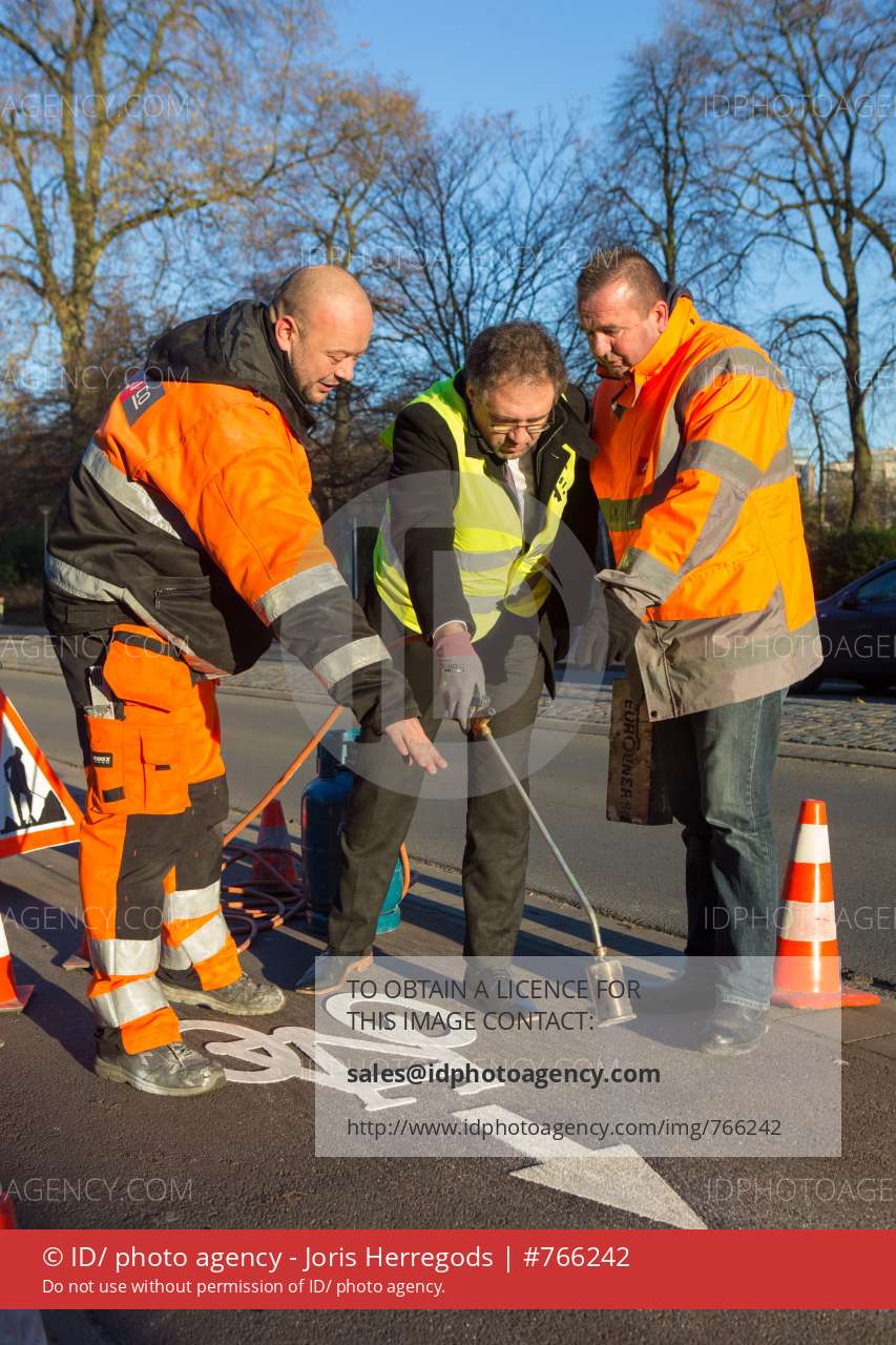 schepen voor mobiliteit Koen Kennis zet de eerste fietsrichtingspijl op het fietspad op de hoek van de Louiza-Marialei en de Rubenslei. de richtingspijlen die op een eenvoudige en duidelijke manier voor meer veiligheid en een betere doorstroming voor fietsers zorgen in de stad.Straat: Louiza-Marielei