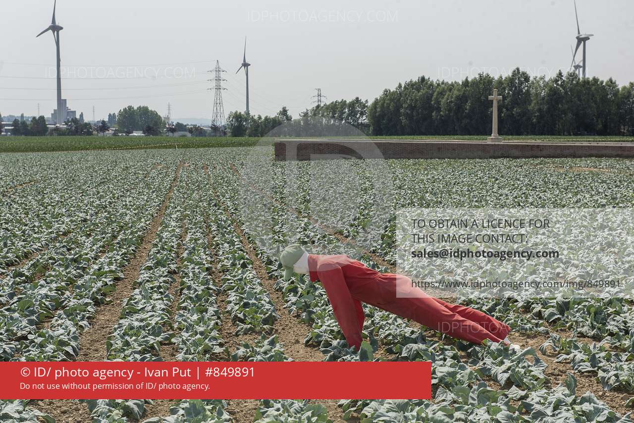 2017/06/21 ieper boezinge belgium : een vogelverschrikker is omgevallen op een door droogte veld koolrabi. no man's cot cemetery in de achtergrond