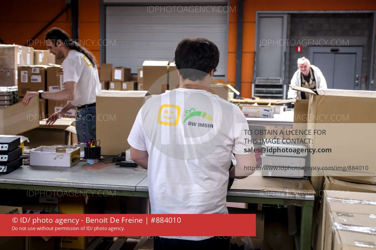 • 2017/09/20, Boom, Belgium. Wat Vlaanderen iedere zondag kan aanschouwen in de één-serie 'Tytgat Chocolat', gebeurt ook in Boom: mensen met een mentale beperking die zich nuttig proberen te maken. Alleen gebeurt het in beschutte werkplaats IMSIR niet met chocolade, maar met digiboxen en modems van telecomoperator Telenet. Nu IMSIR 50 jaar bestaat, is het een goede gelegenheid om die mensen eens in de kijker te zetten. In picture: