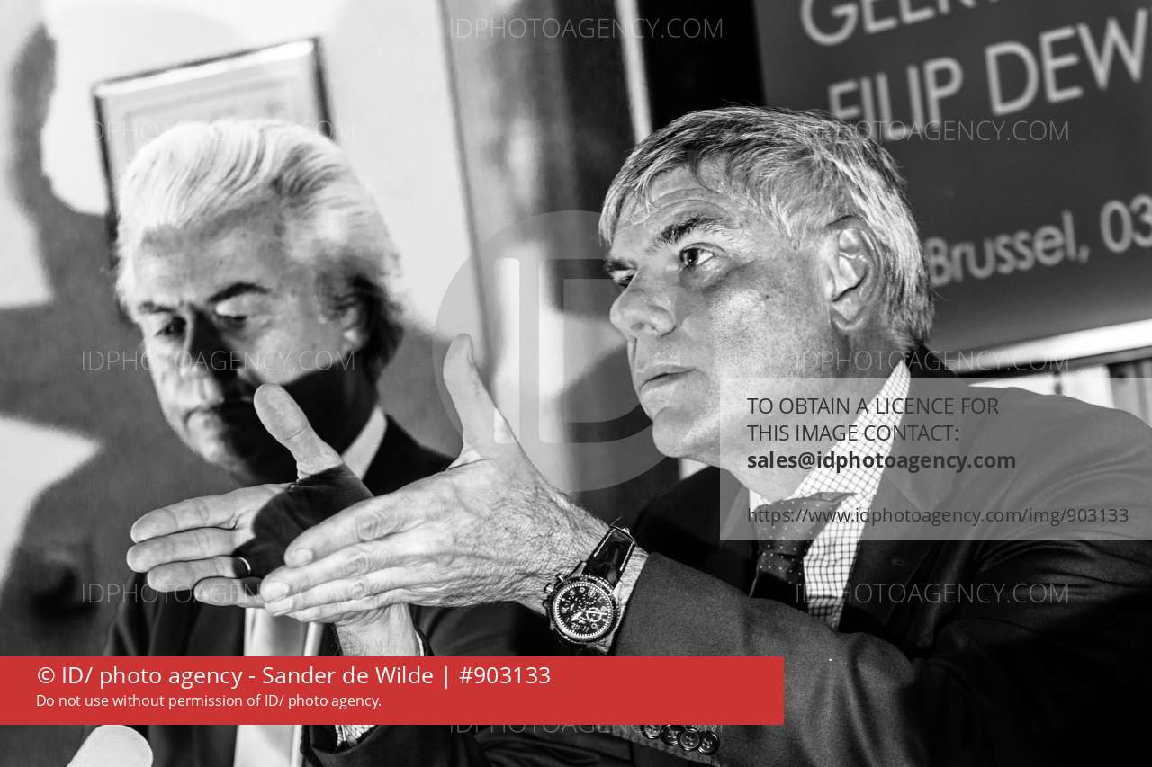 Brussels Belgium 2017 3 november Right wing anti islam politicians Geert Wilders (PVV) (NL) en Filip Dewinter (Vlaams Belang)(BE) speak to the press at the Belgian Federal Parliament during a pressconference. They were supposed to visit the Molenbeek community for an ISlam Safari but this was forbidden by the Mayor of Molenbeek.