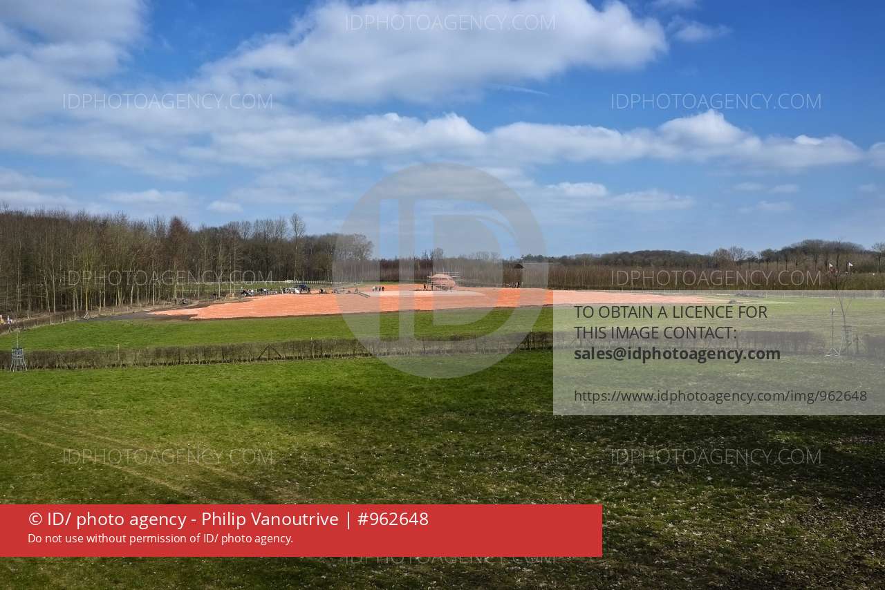 • Zillebeke, Ieper, 24/03/2018. Bijna vier jaar lang hebben tienduizenden vrijwilligers samen 600.000 beeldjes in klei gemaakt voor het WO1-herdenkingsproject CWRM (Coming World Remember Me). Hiermee wil men de 600.000 slachtoffers, militairen van over gans de wereld en de burgers, herdenken die tijdens de Eerste Wereldoorlog op Belgische bodem de dood vonden. Bedenker van het project is de kunstenaar Koen Vanmechelen. De vorm van elk beeldje is een zittende mens die, het hoofd gebogen, de armen rond de benen slaat. Duidelijk zichtbaar is de ruggengraat, symbool voor kracht en stabiliteit. Op zaterdag 24 en zondag 25 maart werden de laatste 50.000 beeldjes neergezet op een glooiend terrein in het provinciaal domein De Palingbeek in Zillebeke, nabij Ieper. Tijdens WO1 werd hier zwaar gevochten. Deze plek bevond zich pal in het niemandsland, tussen de stellingen van de strijdende Duitse en Britse troepen. Te midden van de beeldjes verrijst een gigantisch ei in klei, van ongeveer 10 bij 4 meter. Het ei symboliseert de kracht van het leven, dat zelfs na een vernietigend wereldconflict stand houdt. Vanaf vrijdag 30 maart, tot 11 november 2018, staat de site open voor het publiek. De land artinstallatie kan overschouwd worden vanaf een uitkijkpost. Foto Philip Vanoutrive/ID Photo Agency.
