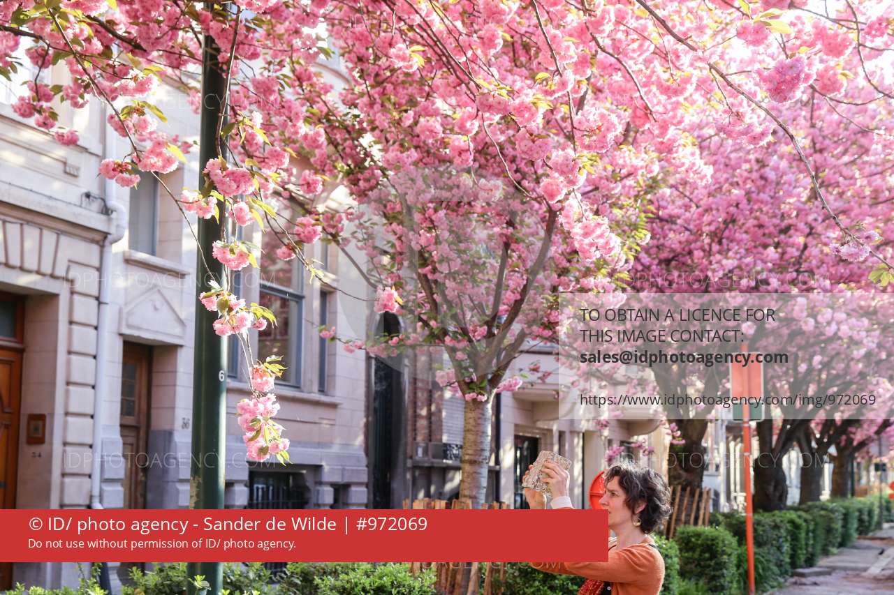 Brussels Schaarbeek Belgium 20 april 2018 dag voor buurtfeest Emile Maxlaan ter ere van de bloei van de japanse kerselaren viel dit jaar precies op de dag dat de roze kerseboom in volle bloei stond en met de wind zijn eerste bloemblaadjes begon ter verliezen.dame fotografeert bloesem