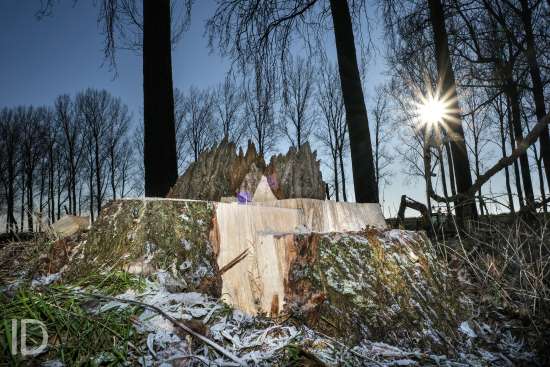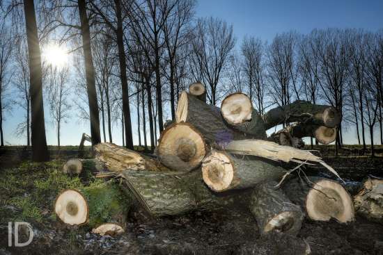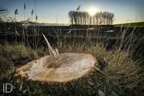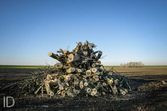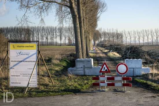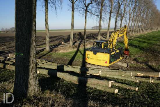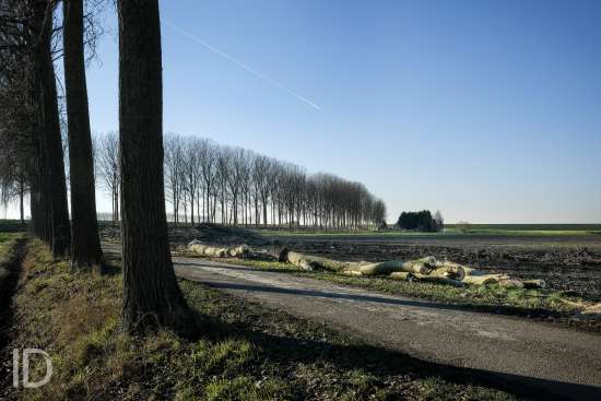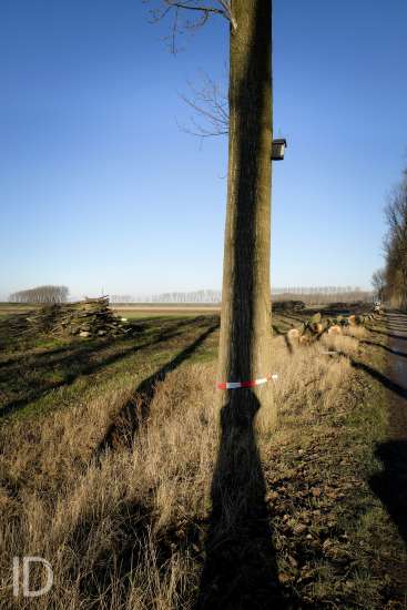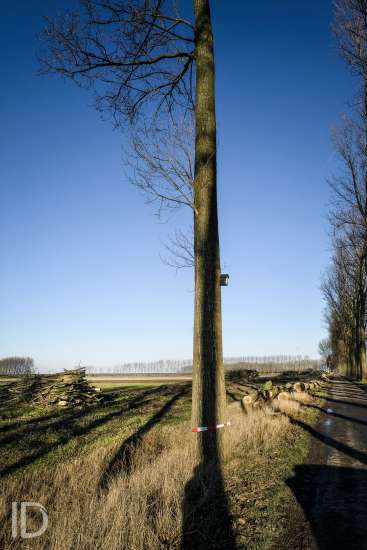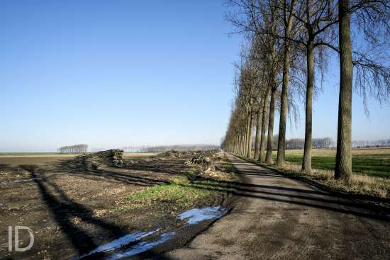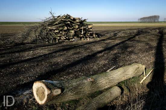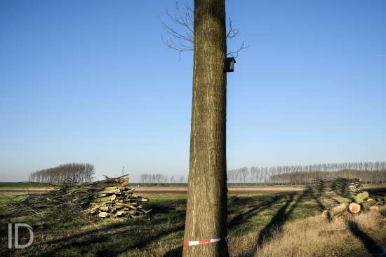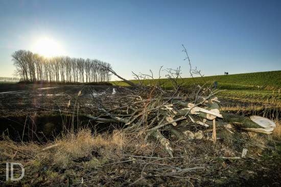 Nederland, Nieuw Namen, 20/01/2019. Tegen 1 maart 2019 moet men rond zijn met het kappen van de bomen in de Hedwigepolder. De Hertogin Hedwigepolder (295 hectare) wordt een getijdennatuurgebied met schorren en slikken als compensatie voor de uitdieping van de Westerschelde. Het jarenlange protest van de bewoners en de landbouwers vermocht niets. De Hedwigepolder maakt samen met de aangrenzende Vlaamse Prosperpolder deel uit van het Sigmaplan. Foto Philip Vanoutrive/ID Photo Agency