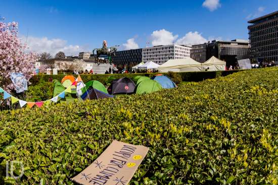 Brussel Belgie 25 Maart 2019 klimaatactivisten bezetten eerst de wetstraat en nu het TROONPLEIN om zo een wetswijziging in de Belgische grondwet te vragen tijdens een stemming van het parlement morgen. Het standbeeld van Leopold II is bedekt met een deken en leuzen voor het klimaat, tegen kolonisatie en voor gele hesjes worden overal opgehangen.