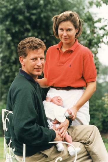 19960801 Aalter, Pieter De Crem zijn echtgenote Caroline Bergez en hun eerste kindje Constantijn bij hun thuis. Hij is verkozen als federaal Volksvertegenwoordiger in 1995 op CVP lijst Gent - Eeklo