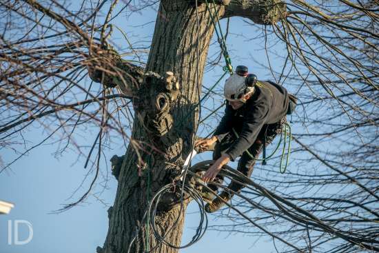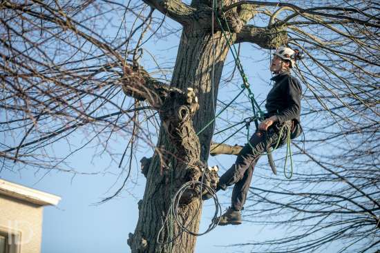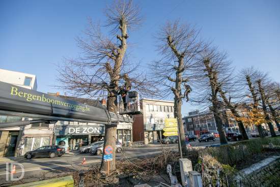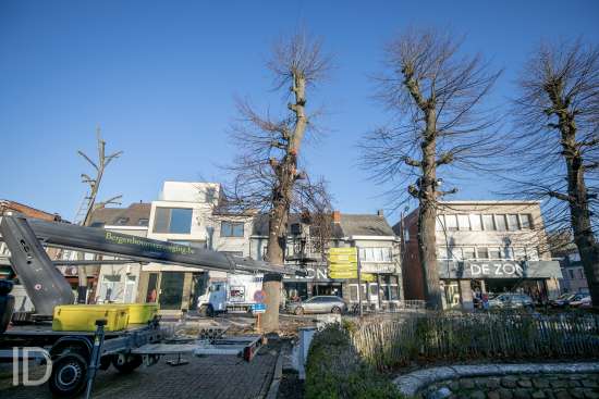 een team van boomverzorgers aan het werk-afknotten bomen Berlaar markt-foto joren de weerdt