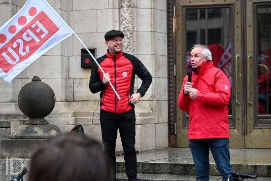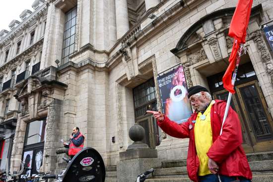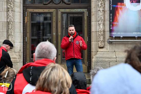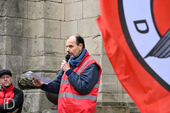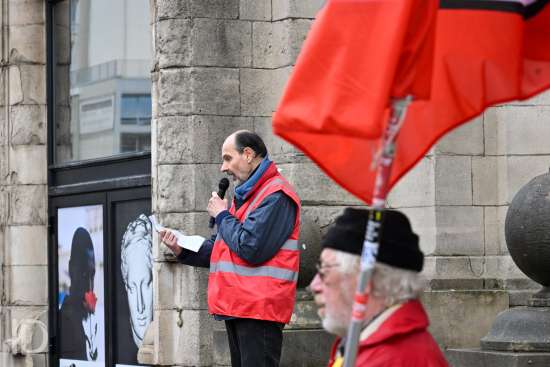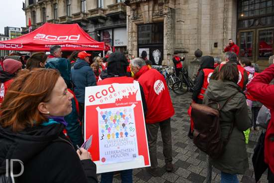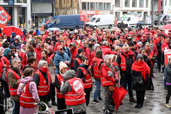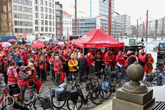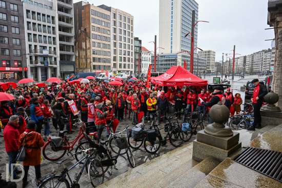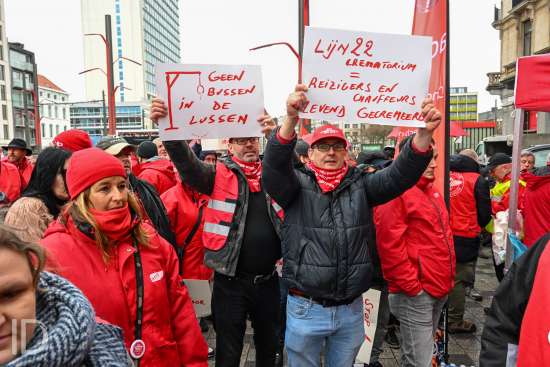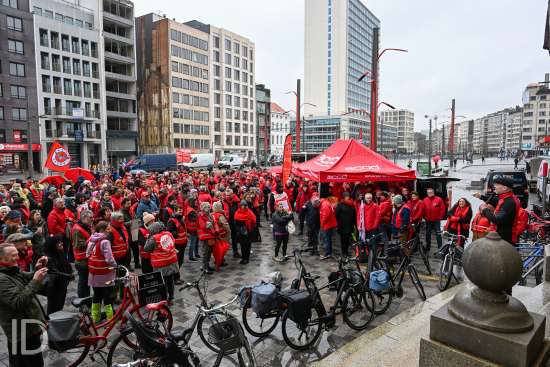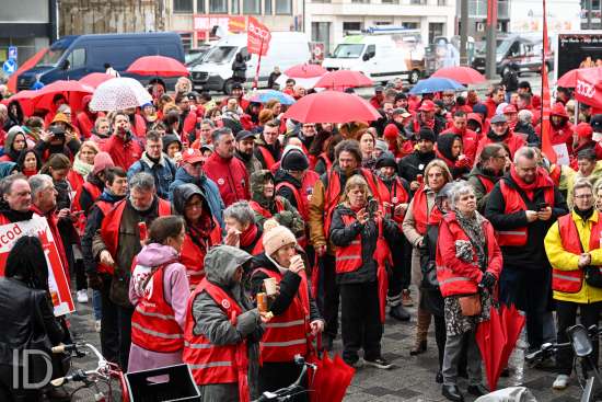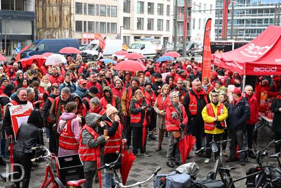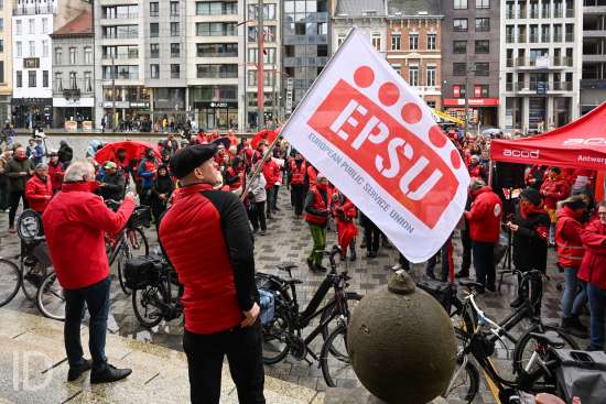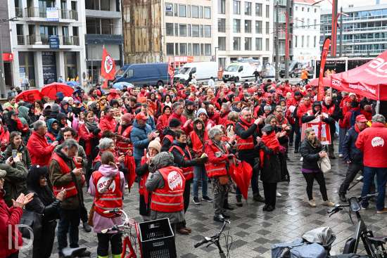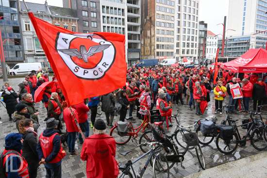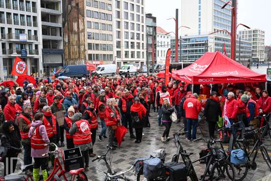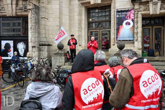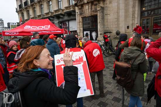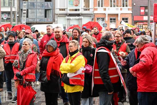 230310 Antwerpen - Verschillende openbare diensten verzamelen op het symbolische uur 11:55 op het Operaplein in kader van de nationale stakingsdag. Het gemeenschappelijk vakbondsfront ACV/ACOD/VSOA organiseert de actie om de aandacht van de politiek te trekken.