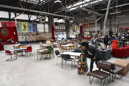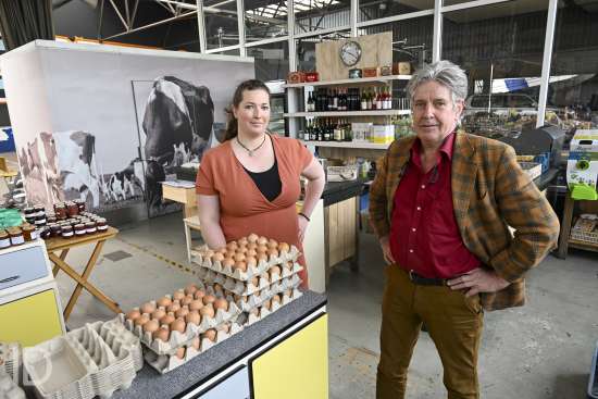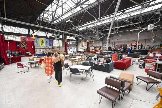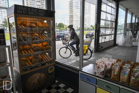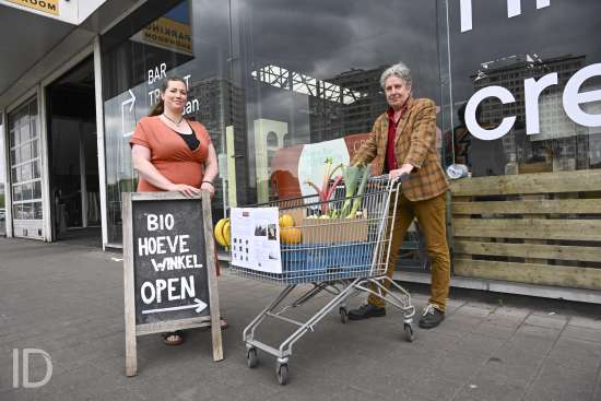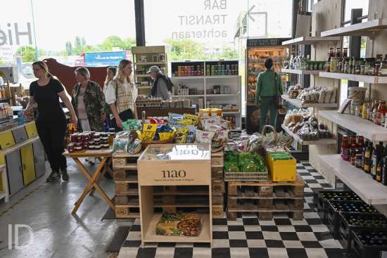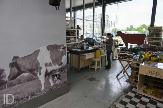 230524 Antwerpen - Bioboerderij Milagro opent een biologische buurtwinkel in de voormalige Permeke Garage op het Kiel, waar ook al buurtbar Transit gevestigd is.