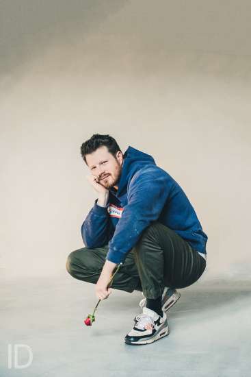 20230717 - Belgium - Studio Carmen De Vos in Antwerpen - Portret van Michael Asnot met naamtag voor album Won't you Stay