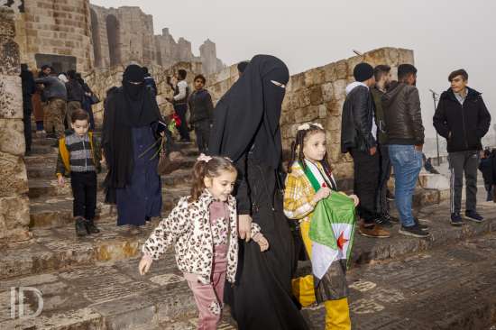 People celebrating the fall of the Assad regime in Aleppo near the famous Citadel. De val van Assad wordt in Aleppo nog steeds uitbundig gevierd nabij de befaamde Citadel in Aleppo.
