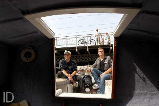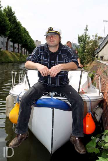 20110615 Gent BELGIUM: Zanger Luc De Vos op zijn boot door de binnenwateren van Gent, graslei, Korenlei, gitaar, muzikant, bootje, boot, sluis ©LIEVEN VAN ASSCHE