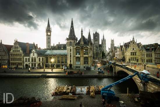 ASS HLN Stormweer Gent, zicht op de Graslei en de 3 torens van Gent, op de voorgrond de Sint-Michielsbrug die ze volledig aan het voorbereiden zijn als filmset voor de Amerikaanse film "Emperor" over Keizer Karel. Foto gemaakt vanuit raampje van jeugdherberg Uppelink. PICTURES NOT INCLUDED IN SOME CONTRACTS *** GENT BELGIUM - 13/08/2015 Photo by James Arthur / Photonews